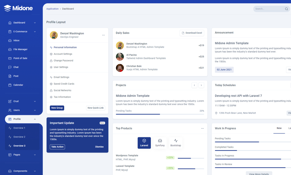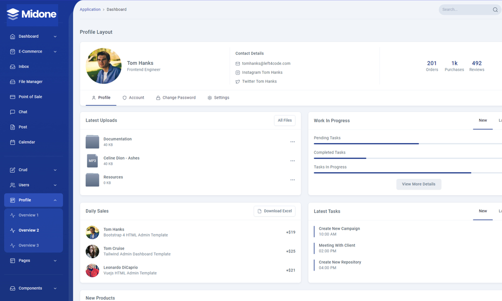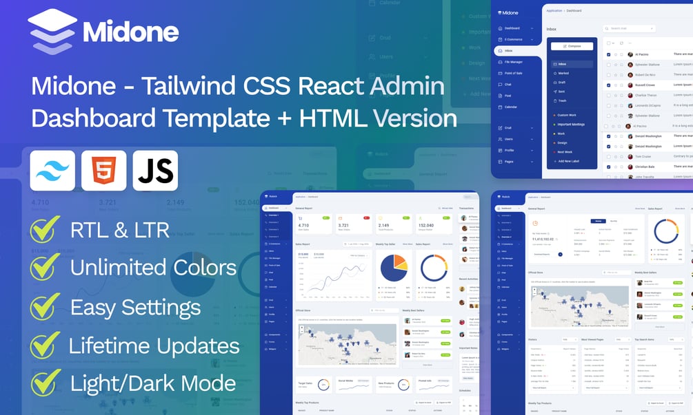 Whether you’re building backend applications, information systems, CRM, or starting a new simple project, Midone is an excellent choice. With its modern, unique, and flexible design, it is perfect for learning how to use Tailwind CSS. Check out the live preview and discover all the themes and features included in the template.
